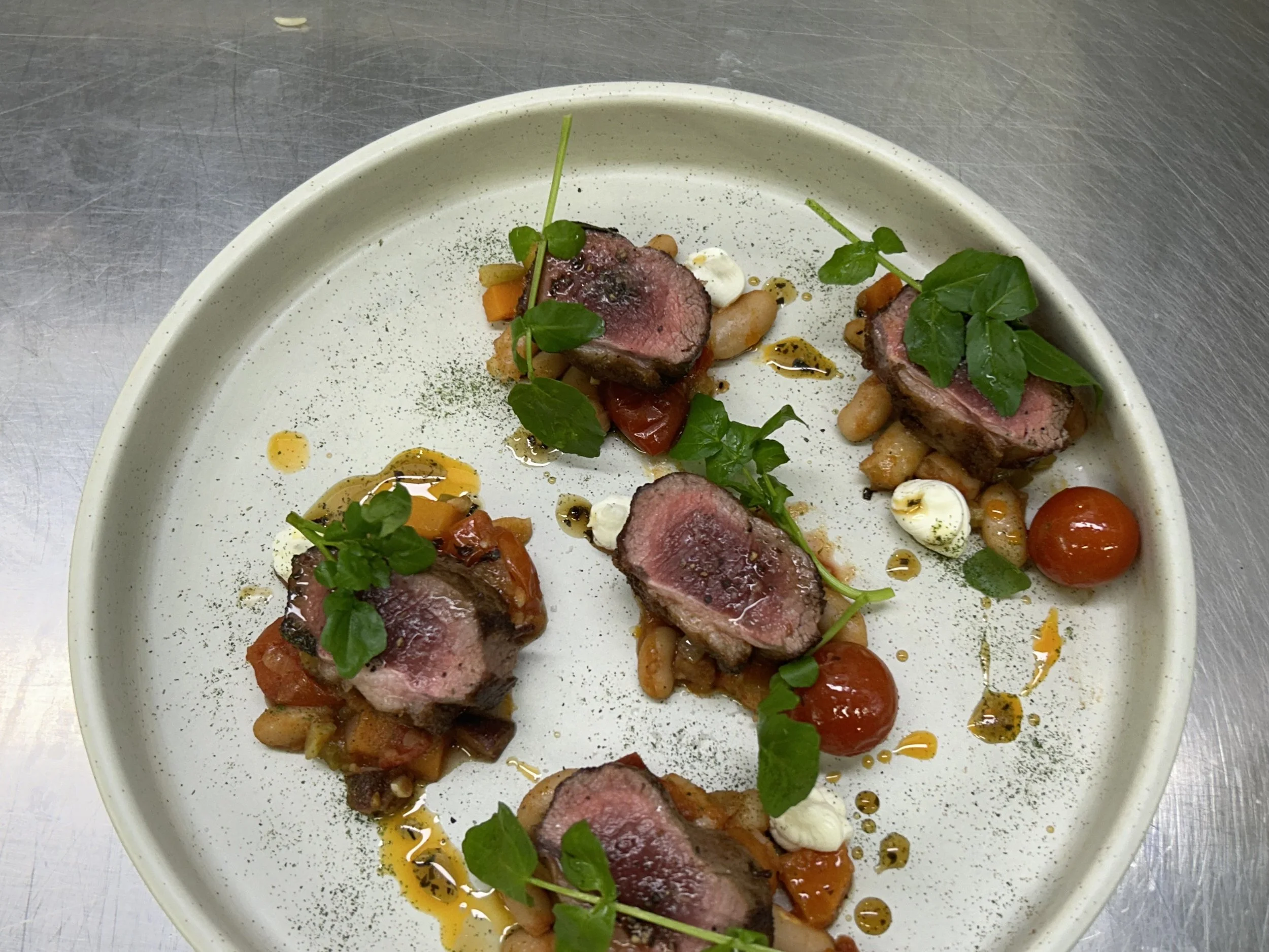 Chargrilled Royalburn Station Lamb Loin, Caponata, Labneh, Chili Crisp, Lamb Jus.